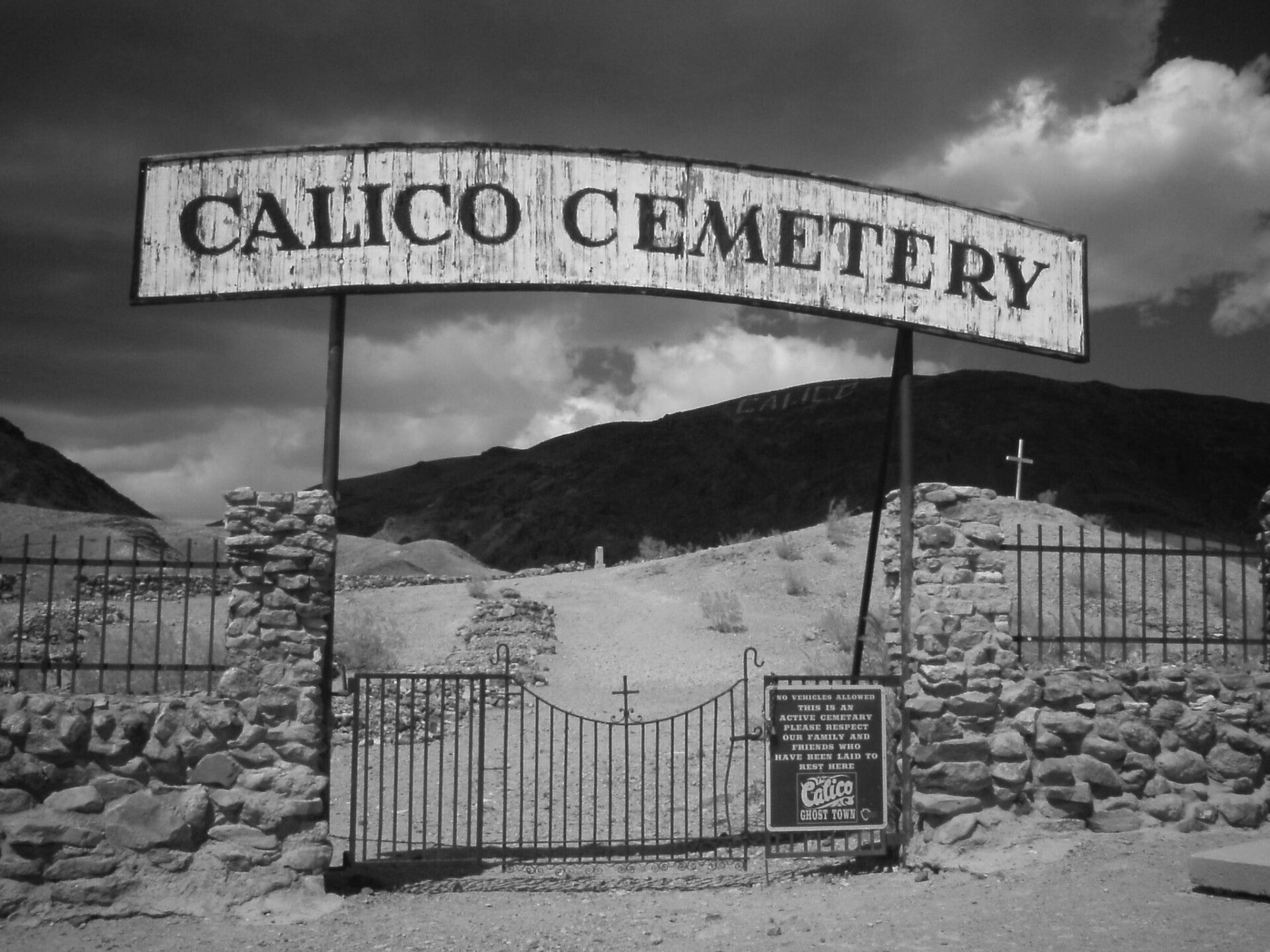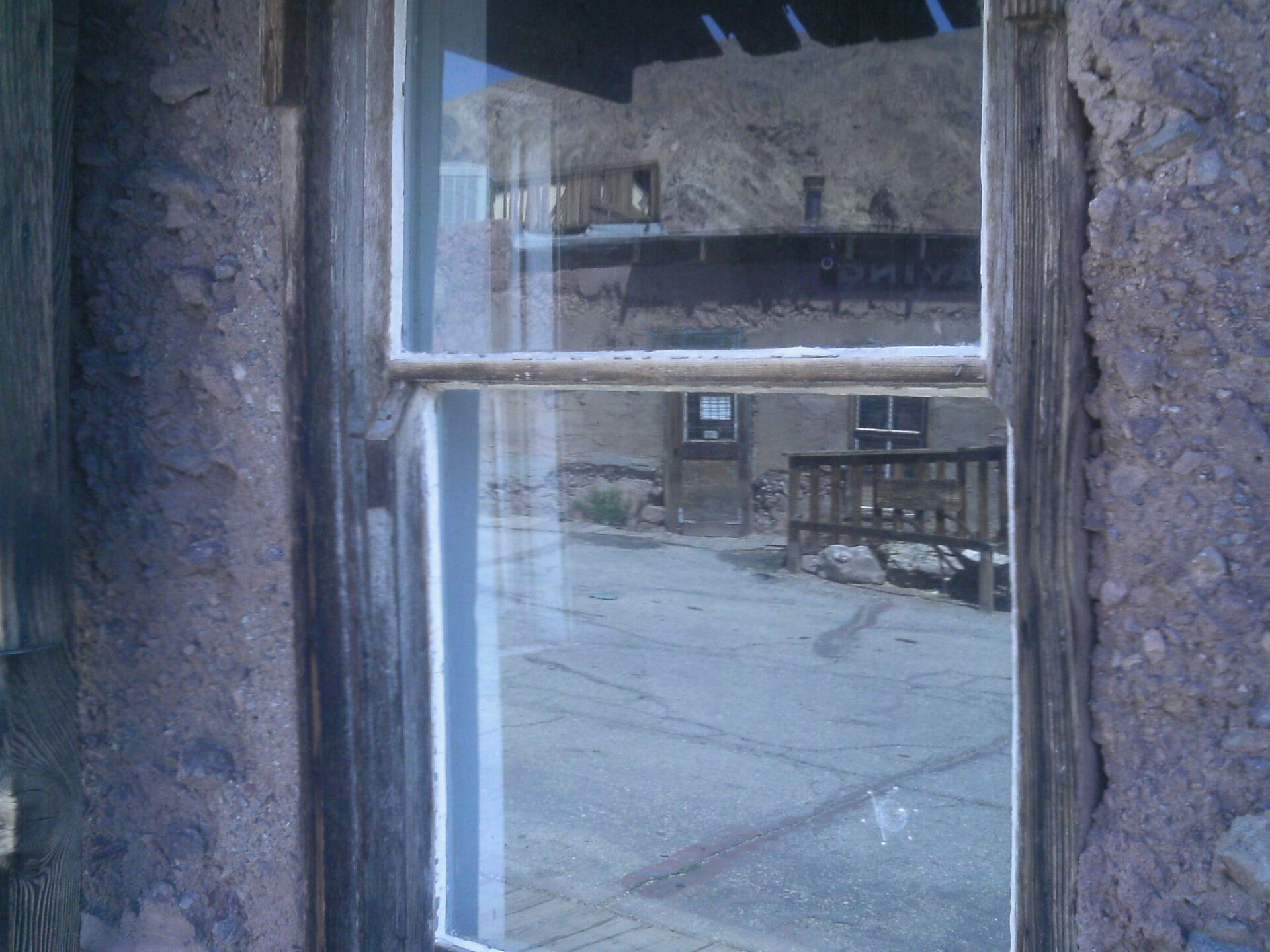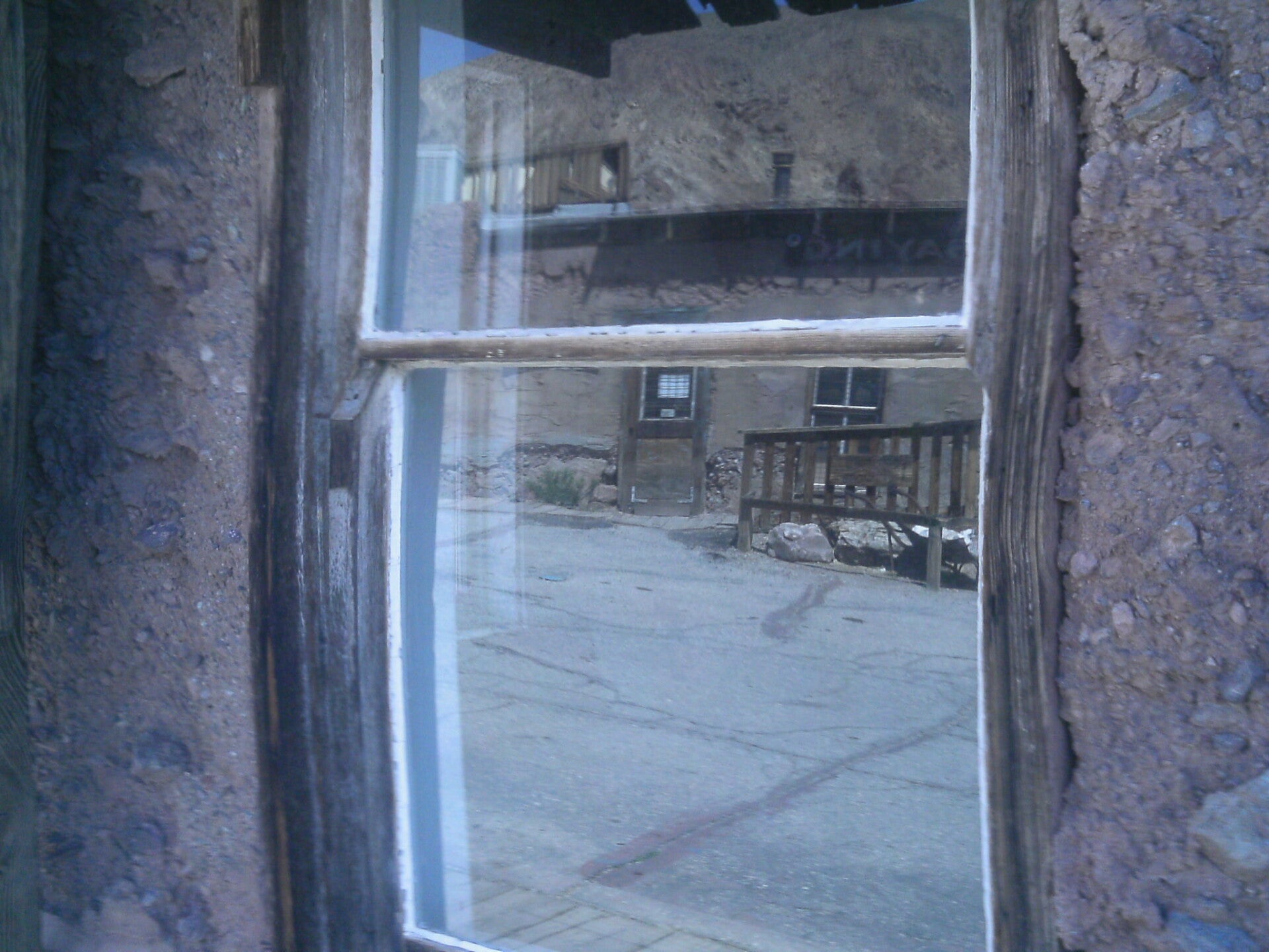 I just like the sign for Calico Cemetery, Calico was used in the 1800's. It was a mining town. The cemetery is still used today. The theater shows an ORB bottom left of black drape and then it moved a bit to the right. This next picture was very interesting. I took a pic out the window of an old building, you can see a badge in the window and then it is gone.